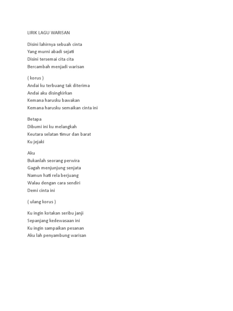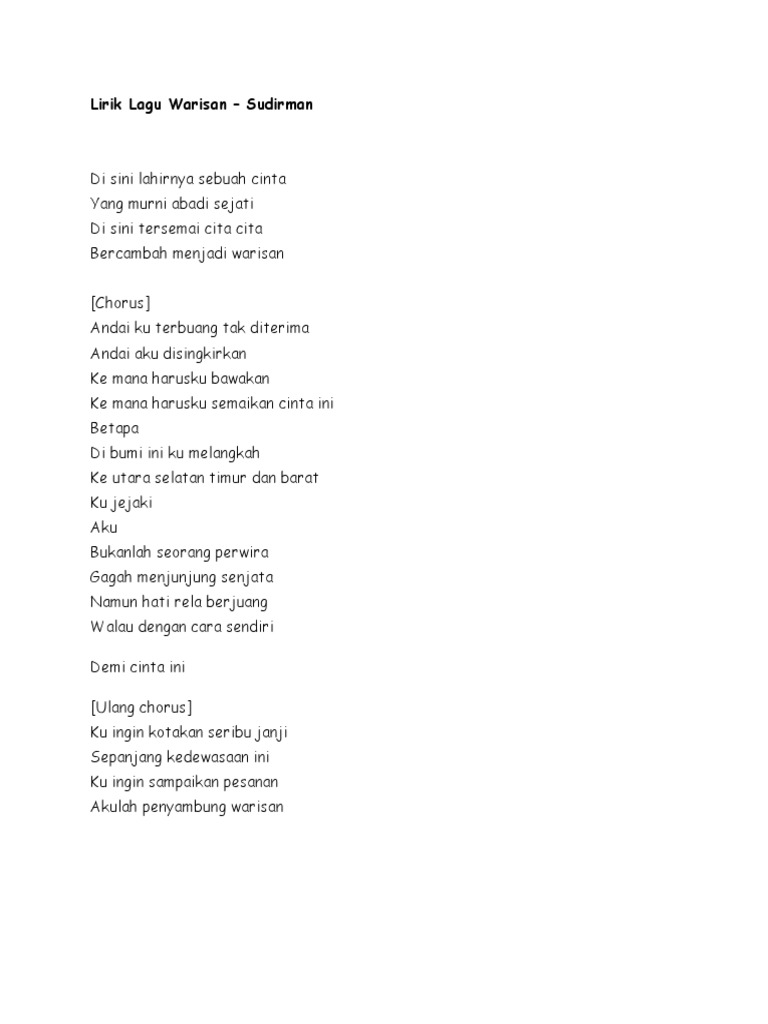 Kajian penerokaan ini tentang integrasi dan kesepaduan nasional melalui penghasilan dan penggunaan muzik popular di Malaysia diharapkan mencetus suatu titik permulaan untuk. Lirik Warisan Pdf - Warisan disini lahirnya sebuah cinta yang murni abadi sejati disini tersemai cita cita bercambah menjadi warisan korus. Kasih D E A Kau warisan.