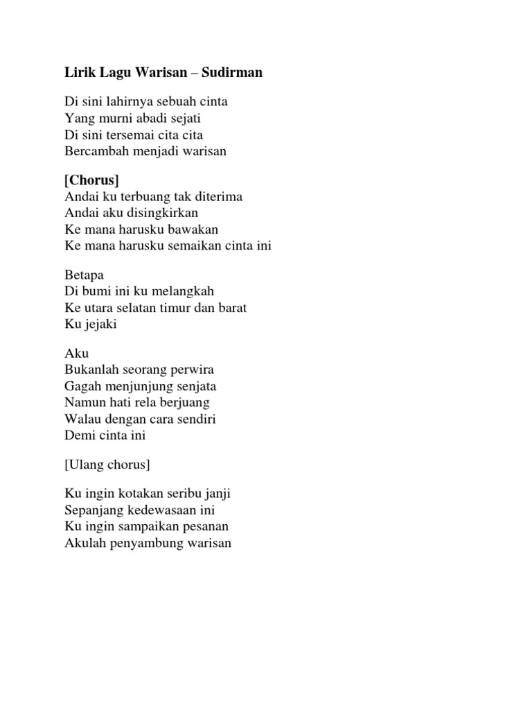 Lirik tajuk warisan. Ramai keliru sebenarnya dengan bait lagu tersebut. Tebas lehernya dahulu baru beri dia kesempatan untuk bertanya. Lirik Lagu Warisan Sudirman.