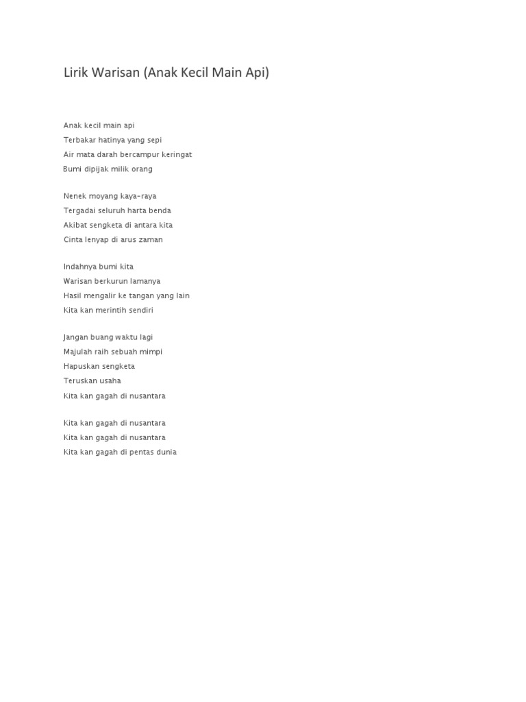 Hasil mengalir ke tangan yang lain. LAGU WARISAN ANAK KECIL MAIN API Anak kecil main api Terbakar hatinya yang sepi Air mata darah bercampur keringat Bumi dipijak milik orang Nenek moyang kaya-raya Tergadai seluruh harta benda Akibat sengketa sesamalah kita Cinta lenyap di arus zaman Indahnya bumi kita ini Warisan berkurun lamanya Hasil mengalir ke tangan yang lain Peribumi merintih sendiri. Persoalannya mampukah mereka menempuhi dan melalui perjalanan yang singkat ini.