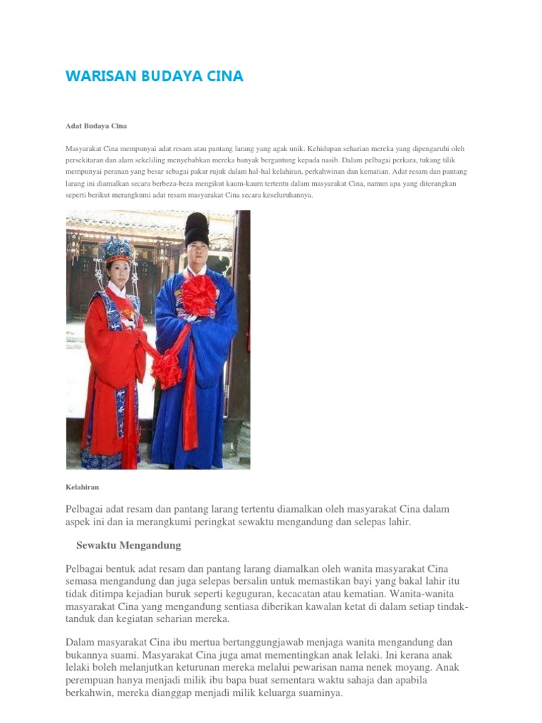 Warisan dan Kebudayaan Kaum Cina di Malaysia. Kehidupan seharian mereka yang dipengaruhi oleh persekitaran dan alam sekeliling menyebabkan mereka banyak bergantung kepada nasib. Indikasi 1 month ago 36 Peh Cun Warisan Budaya Leluhur Cina Benteng 0 5 0 votes Indikasi-HukumTangerang.