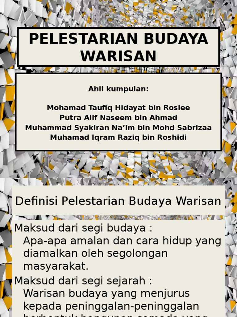 Keunikan seni budaya di Malaysia seperti makyung tarian singa tarian kathak tarian bhangra wayang kulit batik serta songket perlu dipertahan. Warisan budaya adalah benda atau atribut tak berbenda yang merupakan jati diri suatu masyarakat atau kaum yang diwariskan dari generasi-generasi sebelumnya yang dilestarikan untuk generasi-generasi yang akan datang. Warisan terbesar seorang ayah adalah dapat membuat keluarganya sebagai teladan.