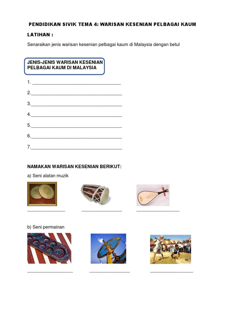- Kepelbagaian dan keunikan warisan kesenian menarikpelancong tempatan dan luar negara. Koleksi Warisan Kesenian Alatan musik Nama. Seni Mempertahankan Diri Terdapat be berap a jenis seni mempertahankan diri di negara ini.