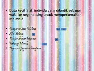 Ciri2 raja sultan dalam mentadbir kerajaannnya. Melayu adalah satu kaum yang beragama islam berbahasa melayu dan mengamalkan budaya melayu. Antara tiga kaum utama di Malaysia ialah MelayuCina dan India telahpun menetap di tanah ini selama 5 abad.